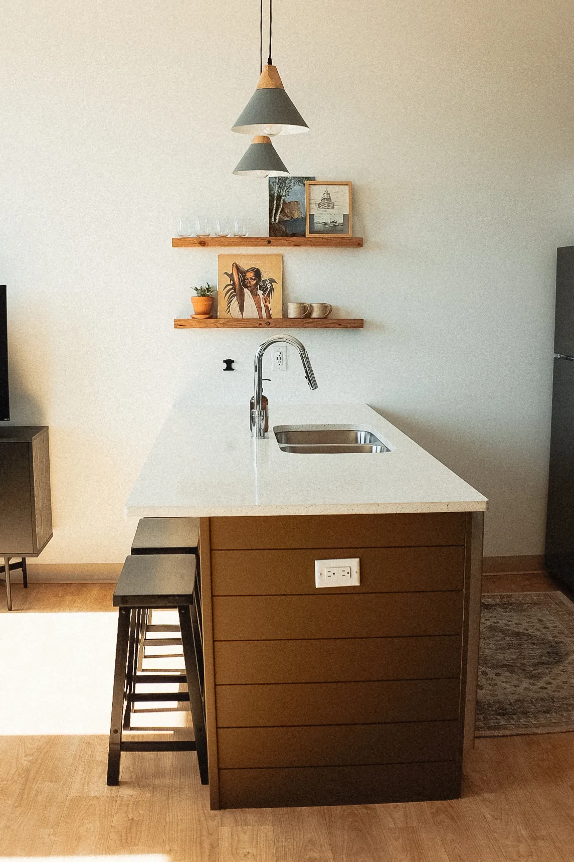 The 431 sqft space was finished in 2020. It has 1 huge window and tall ceilings making this loft airy, elegant and modern. It has been thoughtfully designed with the solo traveler or adventuring couple in mind.