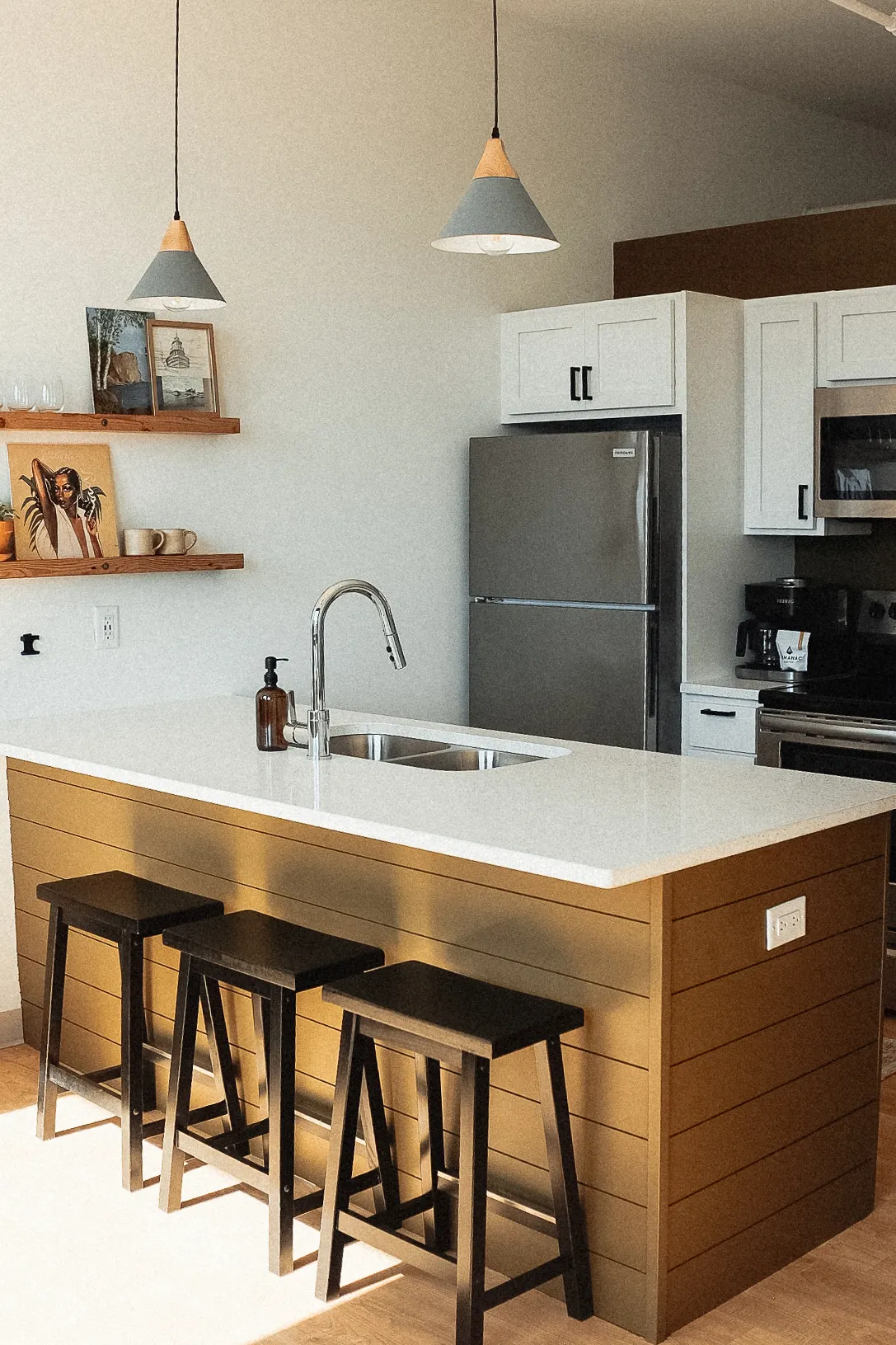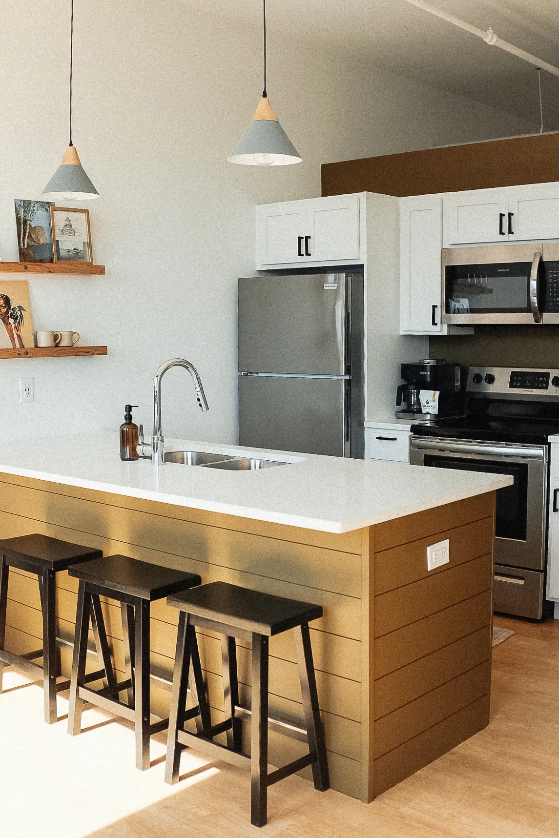 Modern kitchen in Enger Lofts Unit 204 featuring stainless steel appliances, white cabinetry, and wooden accents, ideal for a cozy studio experience in Duluth's Craft District.