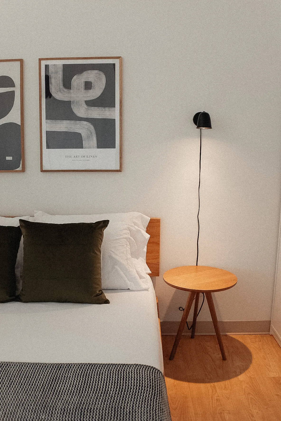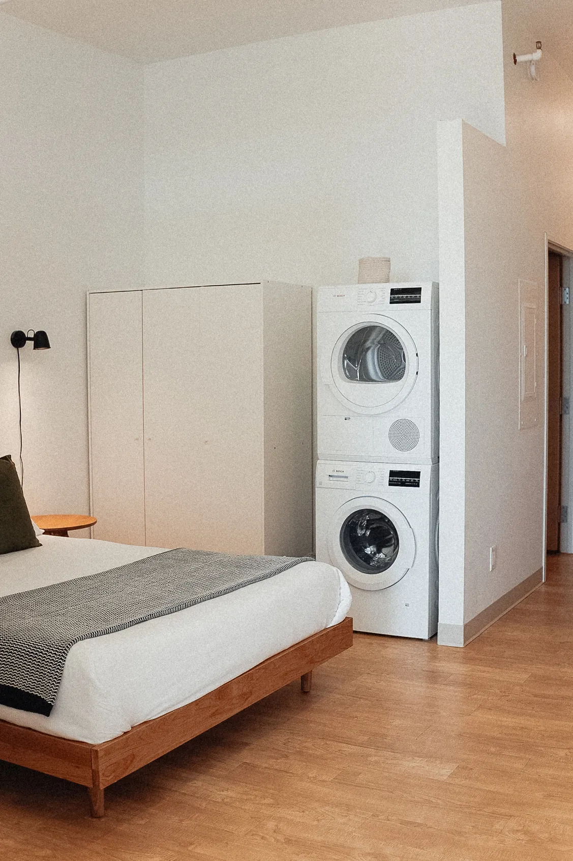 This spacious bedroom alcove is prepared for comfort and relaxation with cotton sheets, a queen size memory foam hybrid mattress, and platform bed frame. Plus, elegant bedside table and lighting, and a wardrobe equipped with an iron, ironing board, and hangers.
