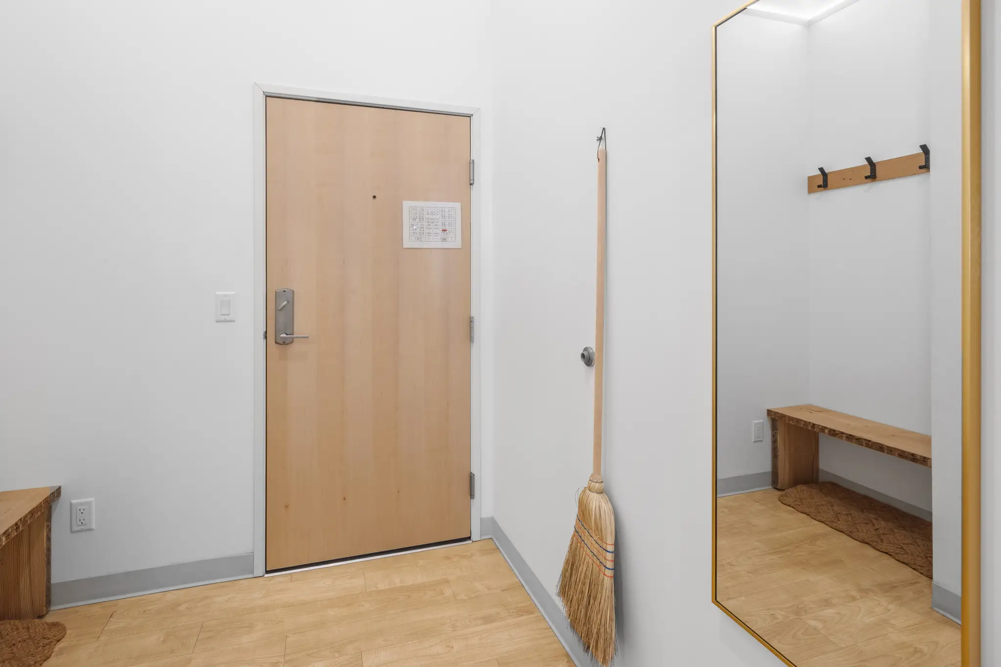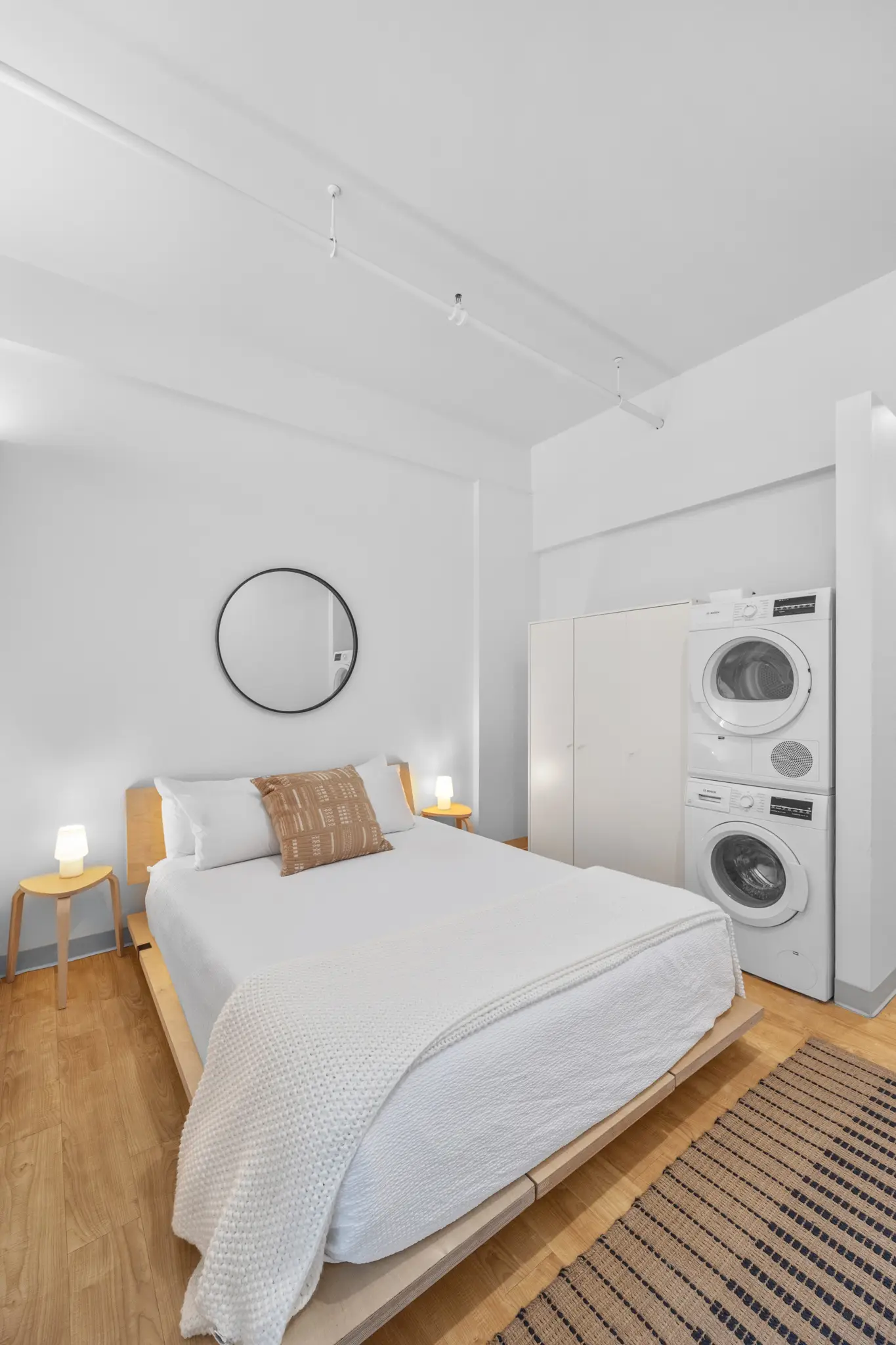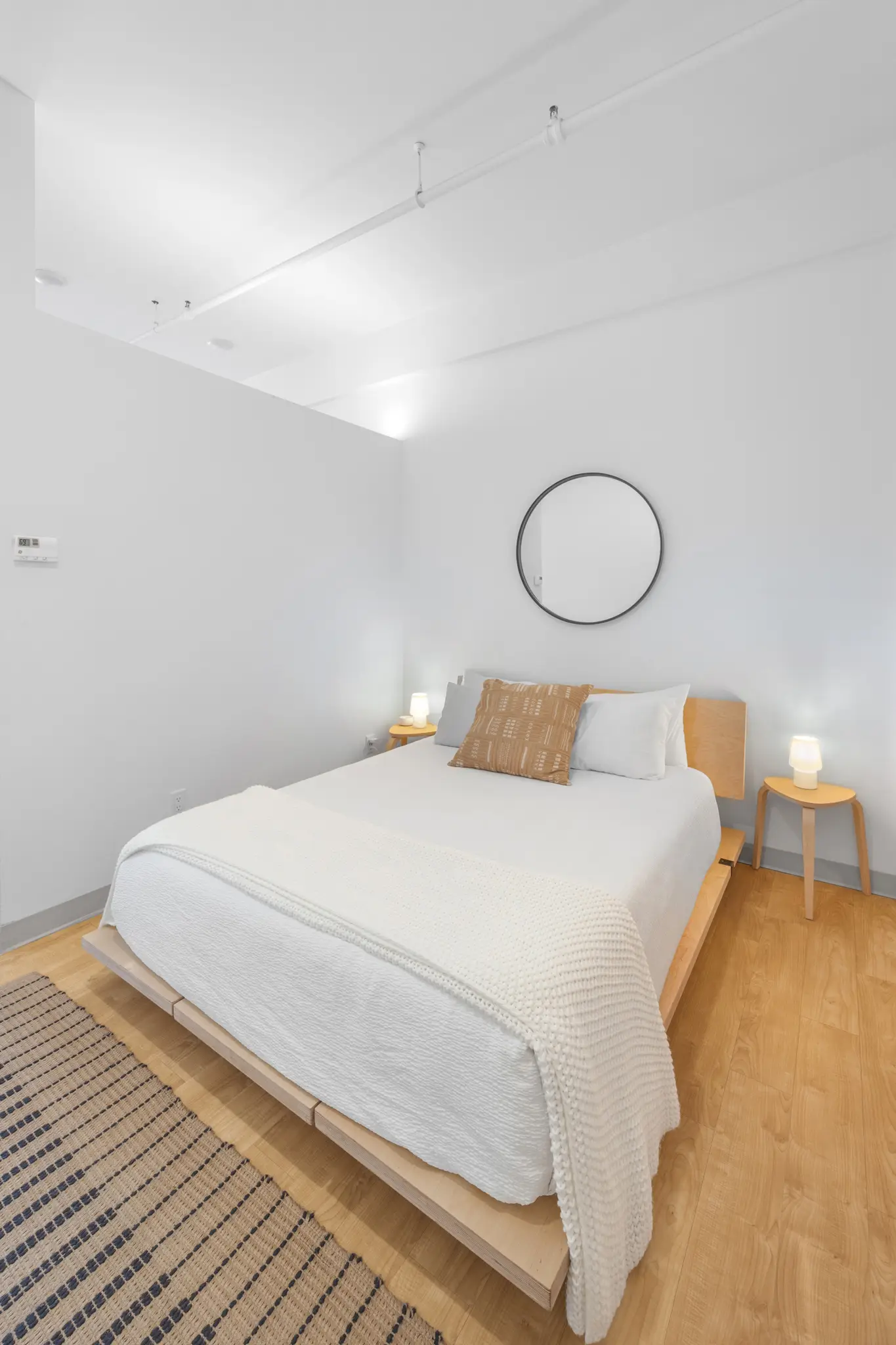 This spacious bedroom alcove is prepared for comfort and relaxation with cotton sheets, a queen size memory foam hybrid mattress, and platform bed frame. Plus, elegant bedside table and lighting, and a wardrobe equipped with an iron, ironing board, and hangers.