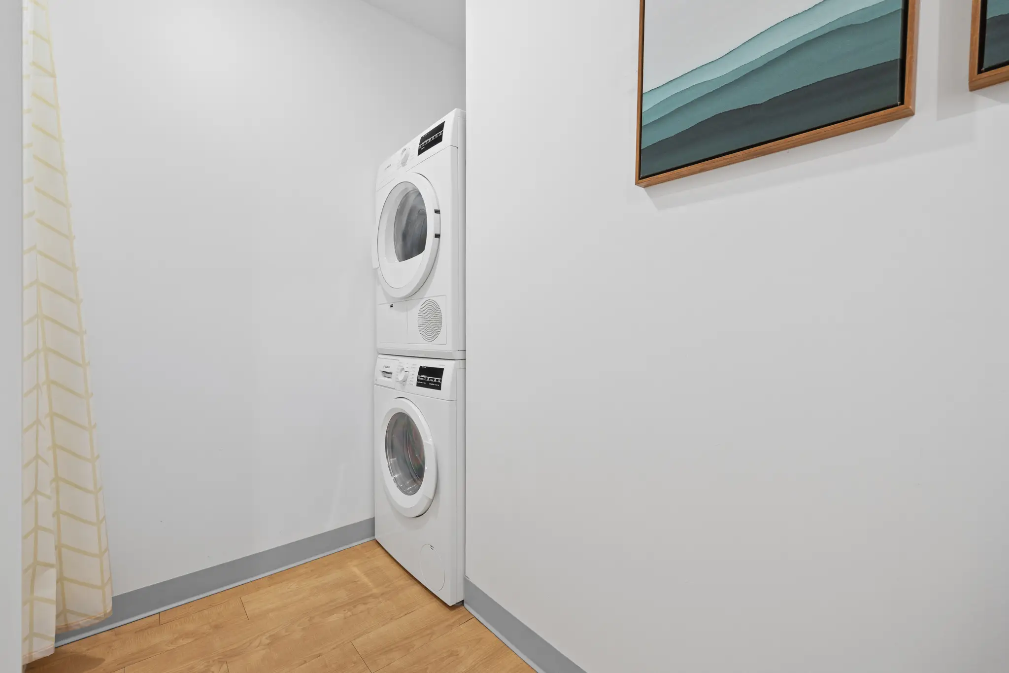 This spacious bedroom alcove is prepared for comfort and relaxation with cotton sheets, a queen size memory foam hybrid mattress, and platform bed frame. Plus, elegant bedside table and lighting, and a wardrobe equipped with an iron, ironing board, and hangers.