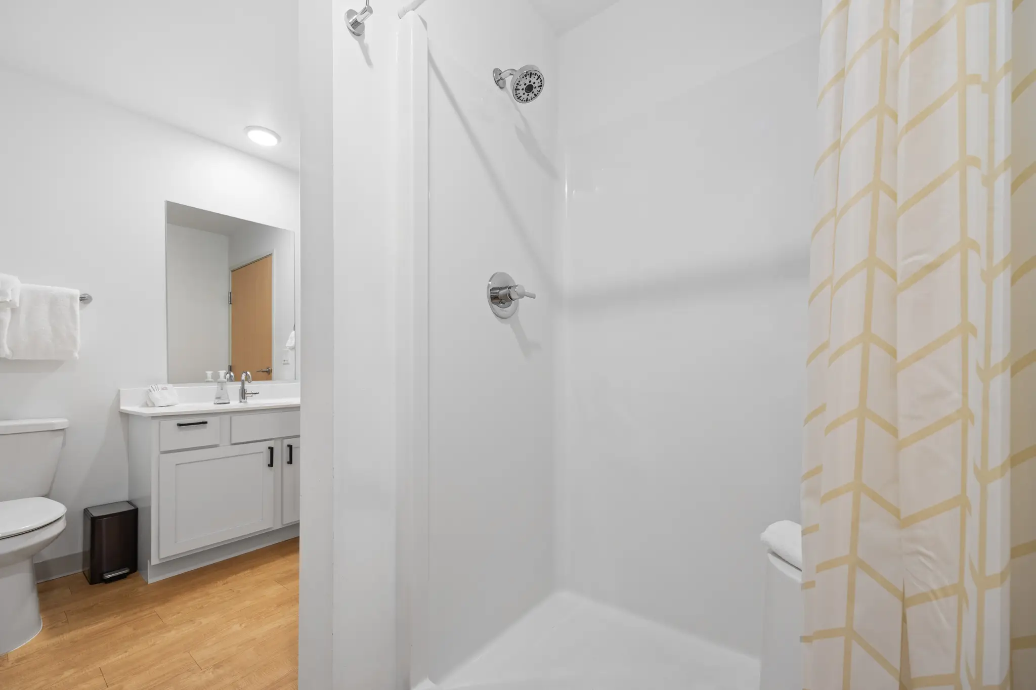 The bathroom is minimalist, spacious and airy. It has a shower, toilet and white vessel sink.